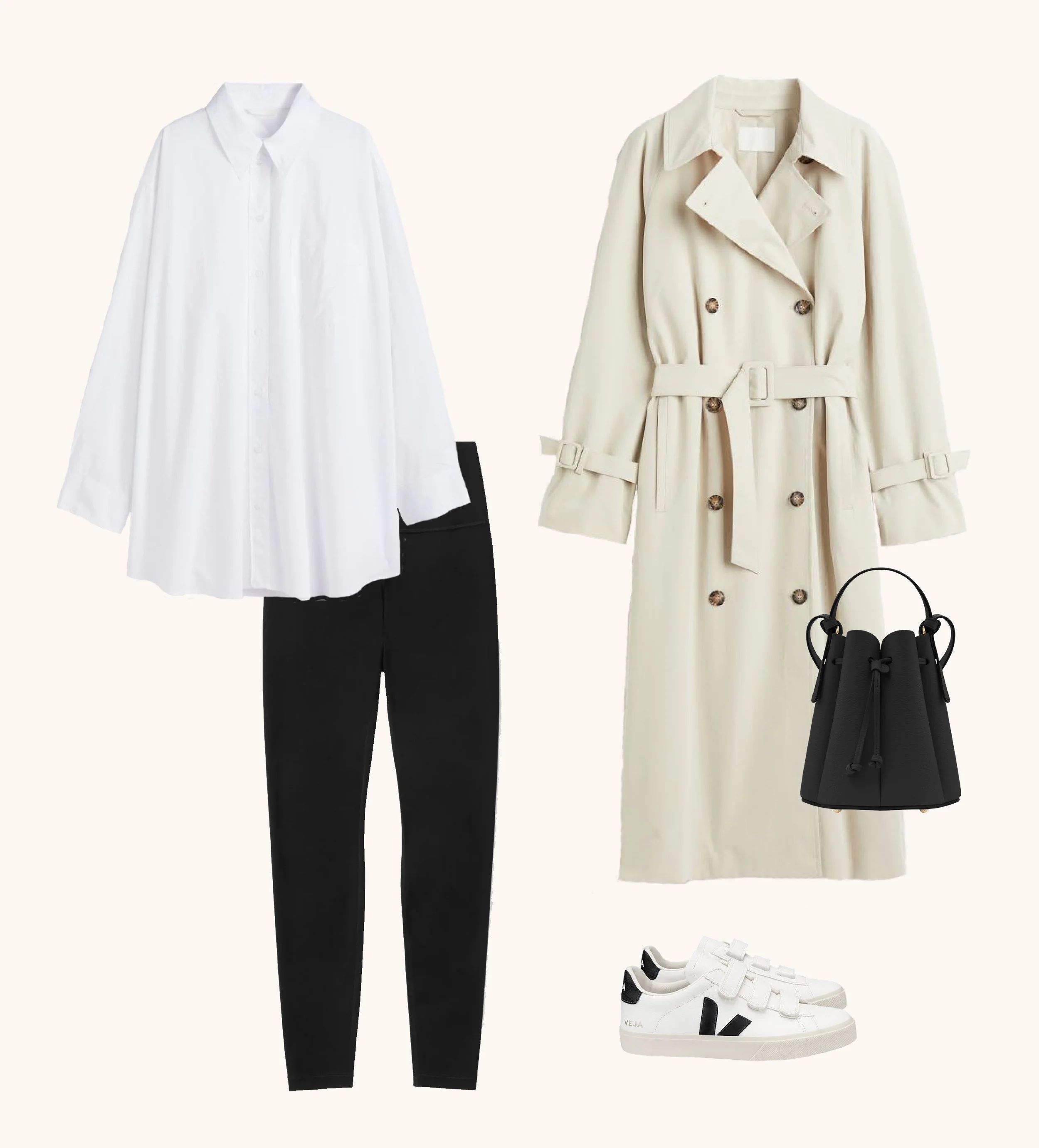 I love an outfit that’s comfortable but still makes me feel put together. Start with a base layer of black leggings, add an oversized white shirt, then layer over a trench for some warmth during this transitional season. Add sneakers for ultimate comfort, or add some loafers for a more dressed-up look. And a crossbody bag always, so the errands can be done hands-free.